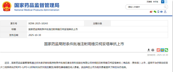 ??? 該產(chǎn)品屬于抗體偶聯(lián)藥物(ADC),適用于治療既往經(jīng)至少二線系統(tǒng)化療和PD-1/PD-L1抑制劑治療失敗的復(fù)發(fā)/轉(zhuǎn)移性鼻咽癌的成人患者。該品種的上市為相關(guān)患者提供了新的治療選擇??贵w偶聯(lián)藥物(Antibody-Drug Conjugate, ADC)是一種結(jié)合了抗體靶向性和細(xì)胞毒藥物殺傷力的新型癌癥治療藥物,通過化學(xué)連接子將單克隆抗體與高效細(xì)胞毒性藥物偶聯(lián),實(shí)現(xiàn)精準(zhǔn)靶向治療。