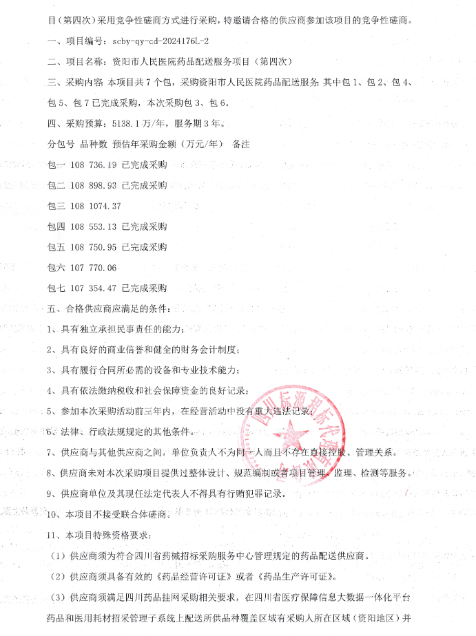 【資陽(yáng)市人民醫(yī)院】四川省資陽(yáng)市人民醫(yī)院藥品配送服務(wù)項(xiàng)目(第四次)競(jìng)爭(zhēng)性磋商采購(gòu)公告