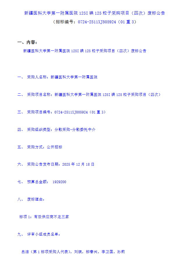 【新疆醫(yī)科大學(xué)第一附屬醫(yī)院】新疆醫(yī)科大學(xué)第一附屬醫(yī)院125I碘125粒子采購項(xiàng)目(四次)廢標(biāo)公告