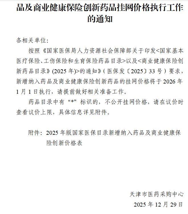 【天津】關(guān)于做好2025年版國(guó)家醫(yī)保目錄新增納入藥品及商業(yè)健康保險(xiǎn)創(chuàng)新藥品掛網(wǎng)價(jià)格執(zhí)行工作的通知