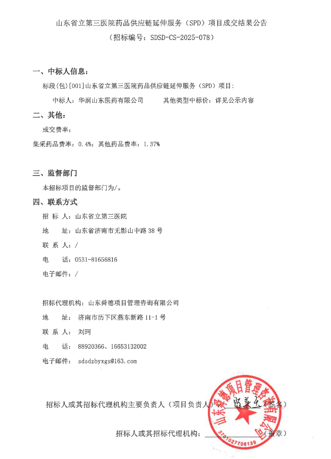 【山東省立第三醫(yī)院】山東省立第三醫(yī)院藥品供應(yīng)鏈延伸服務(wù)(SPD)項(xiàng)目成交結(jié)果公告
