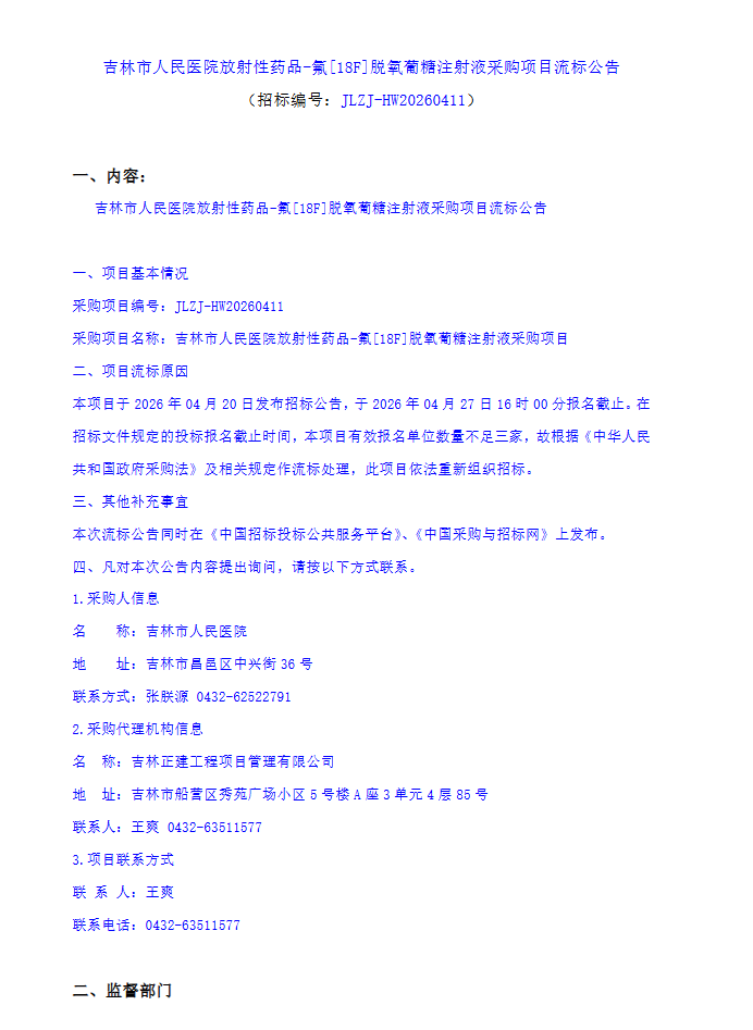 【吉林市人民醫(yī)院】吉林省吉林市人民醫(yī)院放射性藥品-氟〔18F〕脫氧葡糖注射液采購項目流標公告