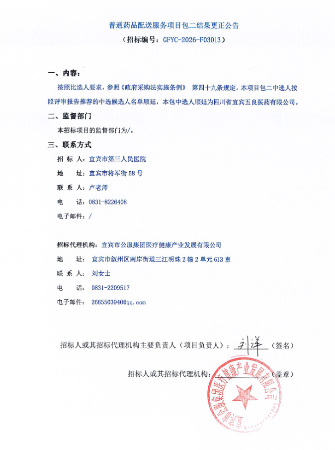 【宜賓市第三人民醫(yī)院】四川省宜賓市第三人民醫(yī)院普通藥品配送服務(wù)項(xiàng)目包二結(jié)果更正公告