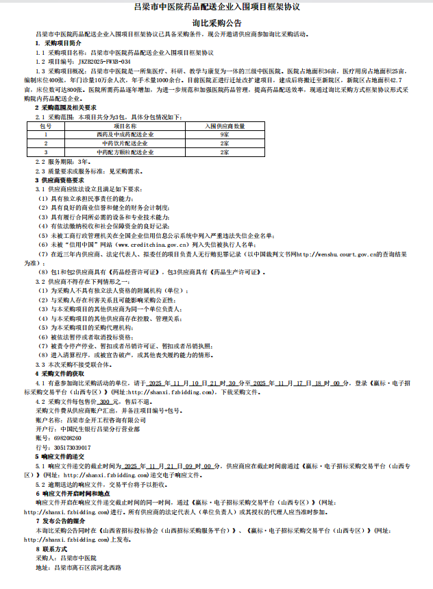 【呂梁市中醫(yī)院】山西省呂梁市中醫(yī)院藥品配送企業(yè)入圍項目框架協(xié)議詢比采購公告