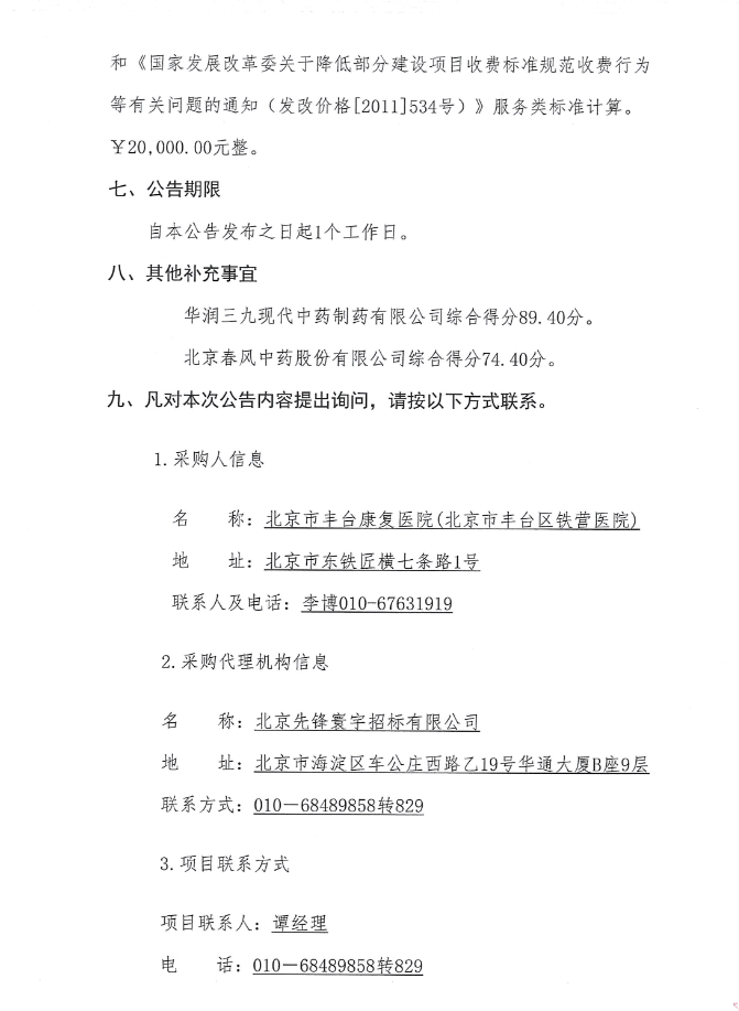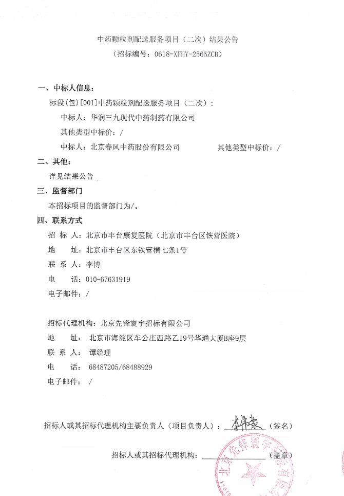 【北京市豐臺康復(fù)醫(yī)院】北京市豐臺康復(fù)醫(yī)院(北京市豐臺區(qū)鐵營醫(yī)院)中藥顆粒劑配送服務(wù)項目(二次)結(jié)果公告