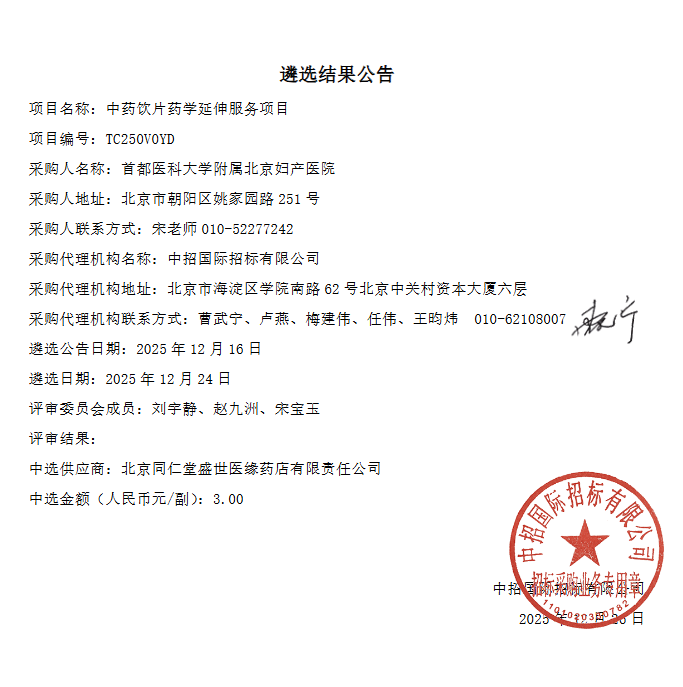 【首都醫(yī)科大學(xué)附屬北京婦產(chǎn)醫(yī)院】北京市首都醫(yī)科大學(xué)附屬北京婦產(chǎn)醫(yī)院中藥飲片藥學(xué)延伸服務(wù)項目遴選結(jié)果公告