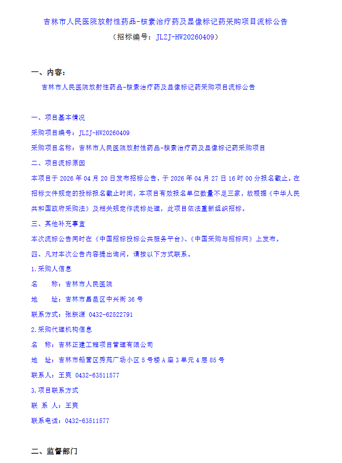 【吉林市人民醫(yī)院】吉林省吉林市人民醫(yī)院放射性藥品-核素治療藥及顯像標記藥采購項目流標公告