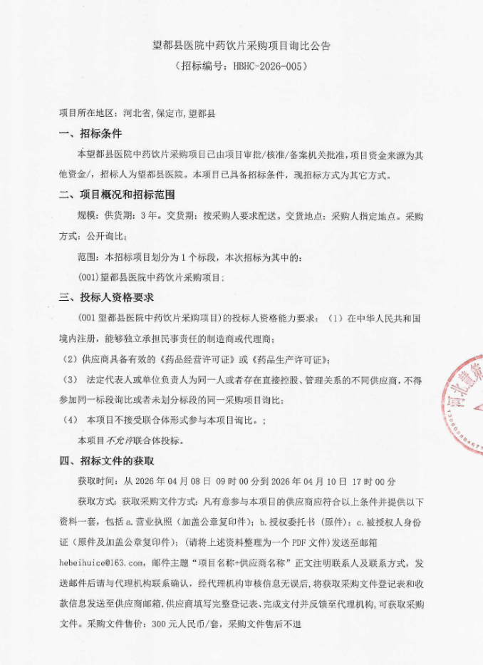 【保定市望都縣醫(yī)院】河北省保定市望都縣醫(yī)院中藥飲片采購(gòu)項(xiàng)目詢比公告