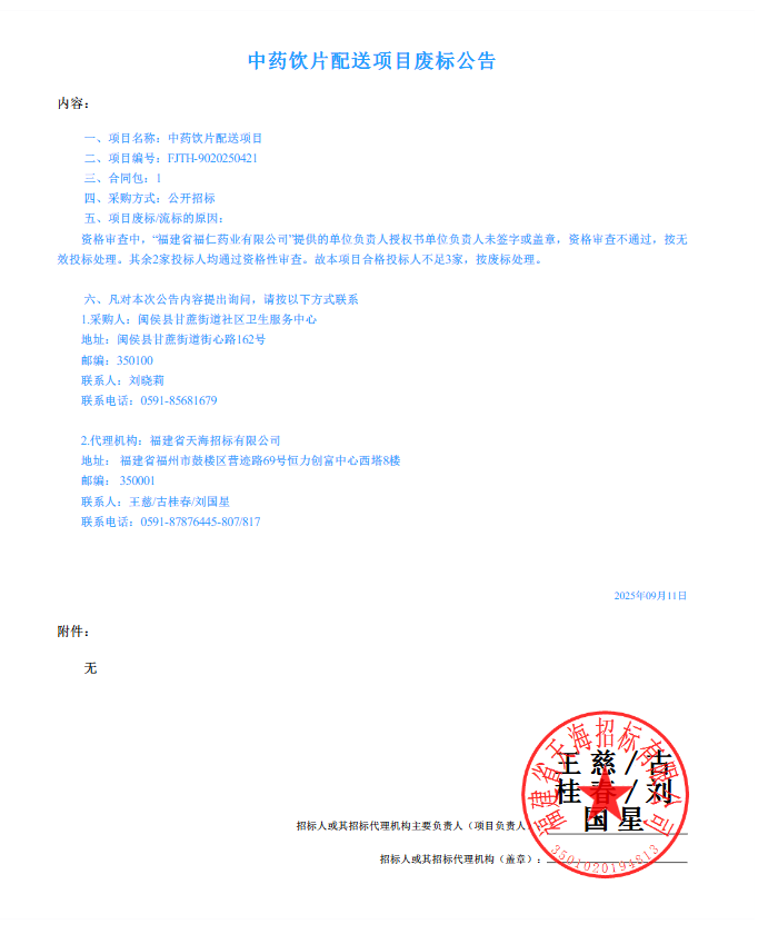【福州市閩侯縣甘蔗街道社區(qū)衛(wèi)生服務中心】福建省福州市閩侯縣甘蔗街道社區(qū)衛(wèi)生服務中心中藥飲片配送項目廢標公告
