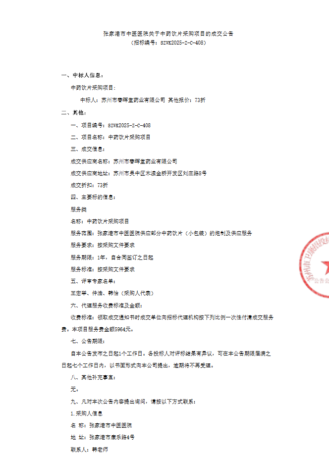 【張家港市中醫(yī)醫(yī)院】江蘇省張家港市中醫(yī)醫(yī)院關(guān)于中藥飲片采購項(xiàng)目的成交公告