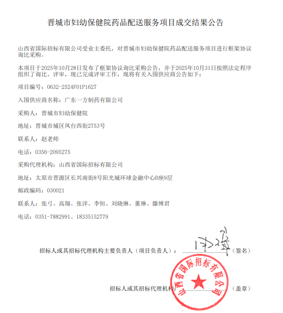 【晉城市婦幼保健院】晉城市婦幼保健院藥品配送服務(wù)項目成交結(jié)果公告