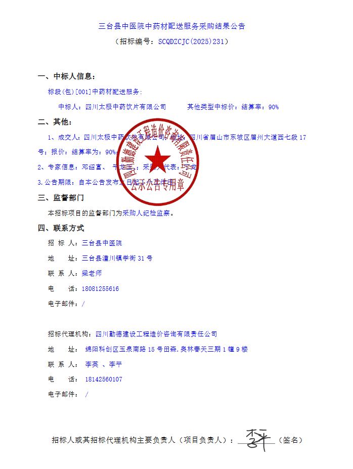 【綿陽市三臺縣中醫(yī)院】四川省綿陽市三臺縣中醫(yī)院中藥材配送服務(wù)采購結(jié)果公告