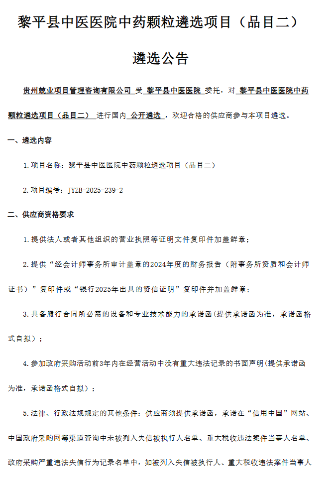 【黔東南苗族侗族自治州黎平縣中醫(yī)醫(yī)院】貴州省黔東南苗族侗族自治州黎平縣中醫(yī)醫(yī)院中藥顆粒遴選項(xiàng)目(品目二)遴選公告