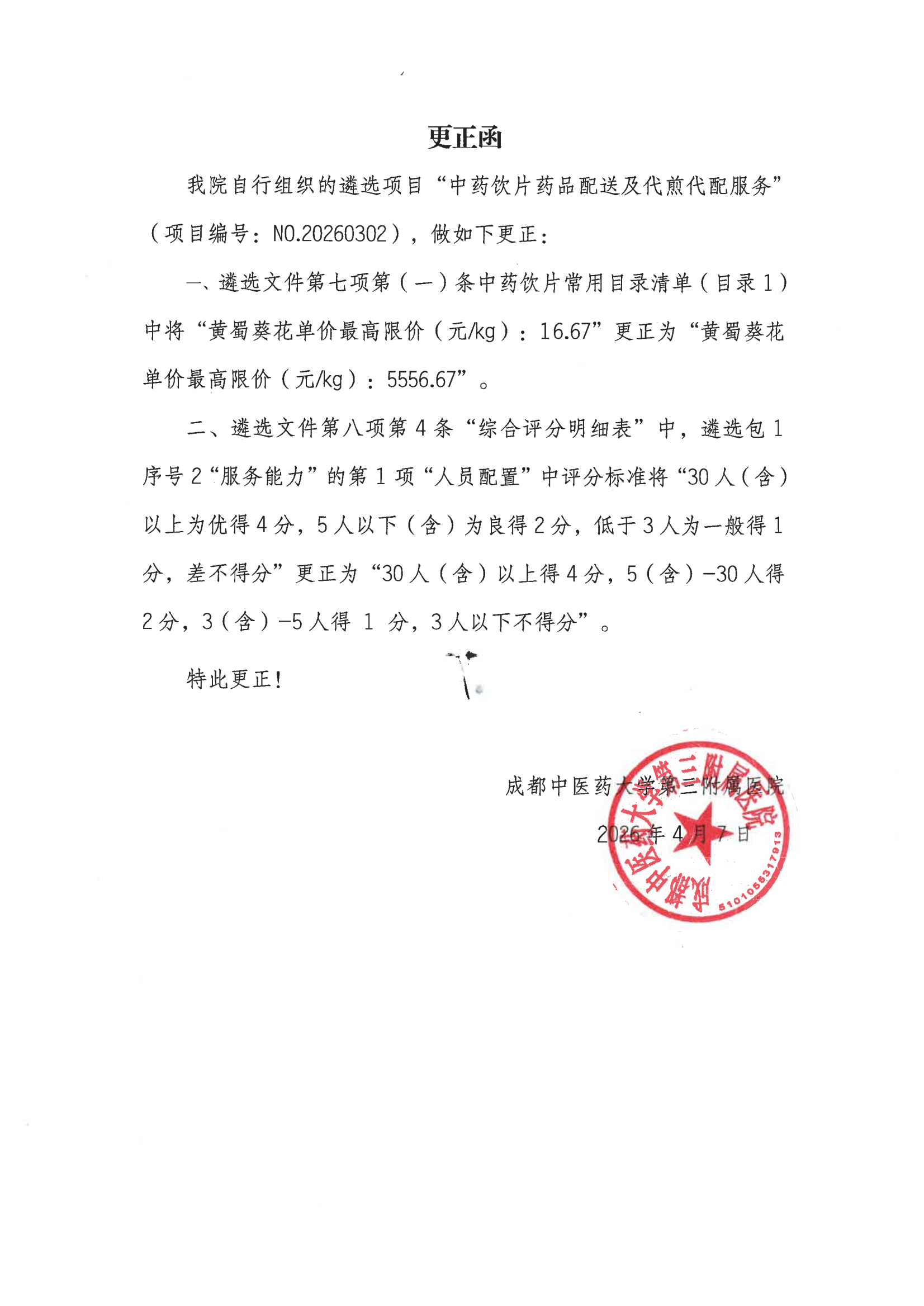 【成都中醫(yī)藥大學(xué)第三附屬醫(yī)院】四川省成都中醫(yī)藥大學(xué)第三附屬醫(yī)院中藥飲片藥品配送及代煎代配服務(wù)遴選文件-更正函