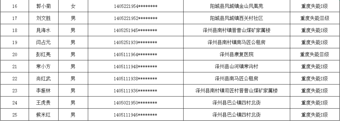 ??? 根據(jù)《長(zhǎng)期護(hù)理失能等級(jí)評(píng)估標(biāo)準(zhǔn)(試行)》《晉城市長(zhǎng)期護(hù)理保險(xiǎn)失能評(píng)定管理辦法(試行)》規(guī)定,經(jīng)評(píng)定,楊志孔、趙學(xué)平等25位同志符合重度失能標(biāo)準(zhǔn),現(xiàn)予以公示。