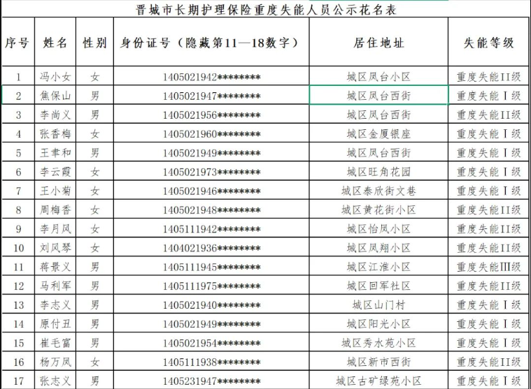 ??? 根據(jù)《長(zhǎng)期護(hù)理失能等級(jí)評(píng)估標(biāo)準(zhǔn)(試行)》《晉城市長(zhǎng)期護(hù)理保險(xiǎn)失能評(píng)定管理辦法(試行)》規(guī)定,經(jīng)評(píng)定,馮小女、焦保山等17位同志符合重度失能標(biāo)準(zhǔn),現(xiàn)予以公示(詳見附表)。