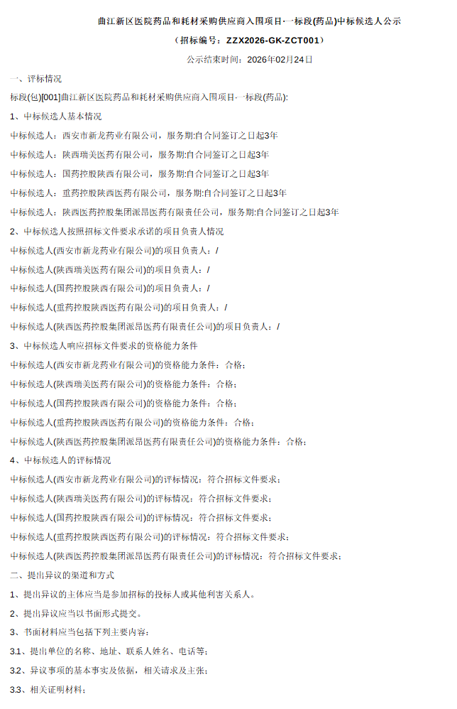 【西安市曲江新區(qū)醫(yī)院】陜西省西安市曲江新區(qū)醫(yī)院藥品和耗材采購供應(yīng)商入圍項目·一標(biāo)段(藥品)中標(biāo)候選人公示