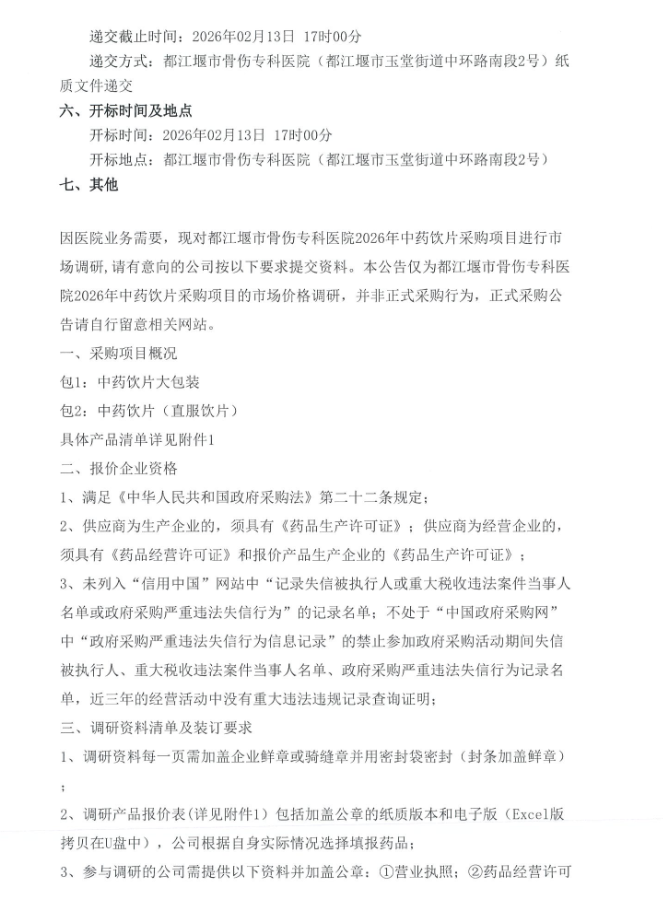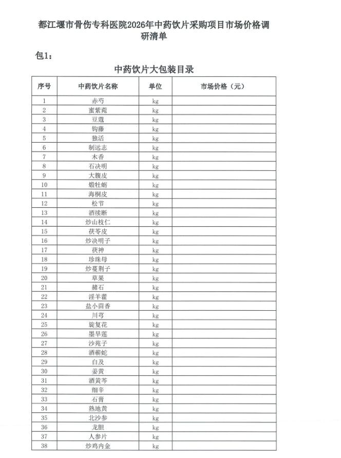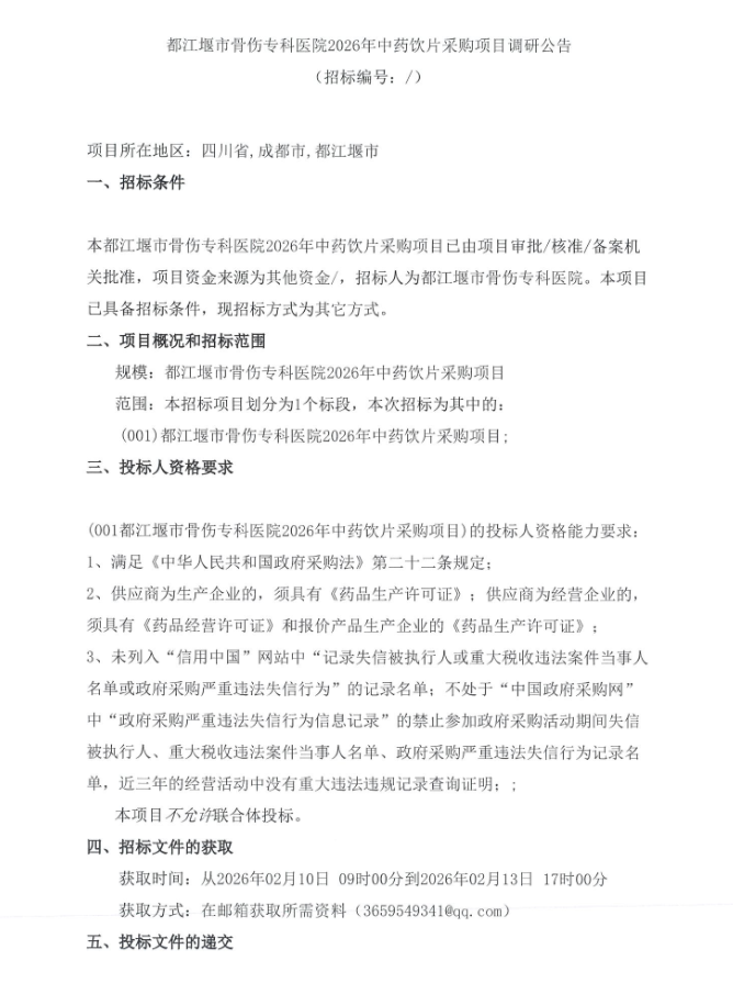 【成都市都江堰市骨傷??漆t(yī)院】四川省成都市都江堰市骨傷??漆t(yī)院2026年中藥飲片采購項目調(diào)研公告