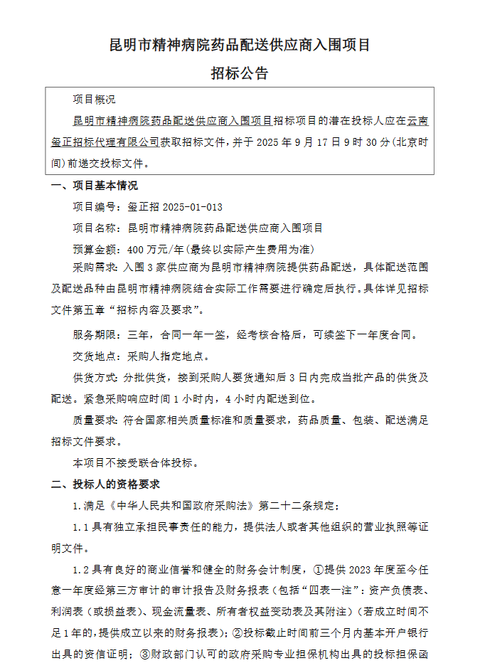 【昆明市精神病院】云南省昆明市精神病院藥品配送供應(yīng)商入圍項目招標(biāo)公告