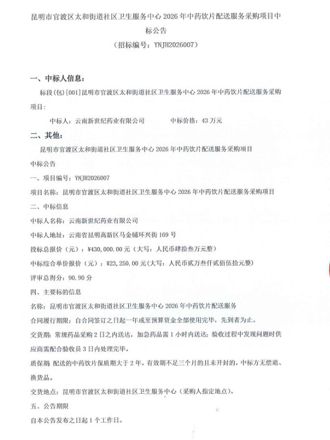 【昆明市官渡區(qū)太和街道社區(qū)衛(wèi)生服務(wù)中心】云南省昆明市官渡區(qū)太和街道社區(qū)衛(wèi)生服務(wù)中心2026年中藥飲片配送服務(wù)采購項目中標(biāo)公告