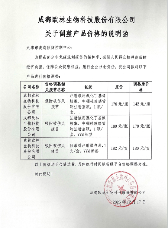 日前,我市收到長春百克生物科技股份公司、上海榮盛生物藥業(yè)股份有限公司、北京科興生物制品有限公司、成都歐林生物科技股份有限公司、北京民海生物科技有限公司關于產品價格調整的說明函,現將調整后的價格進行公示,執(zhí)行時間自掛網之日起執(zhí)行。