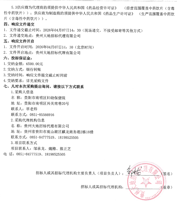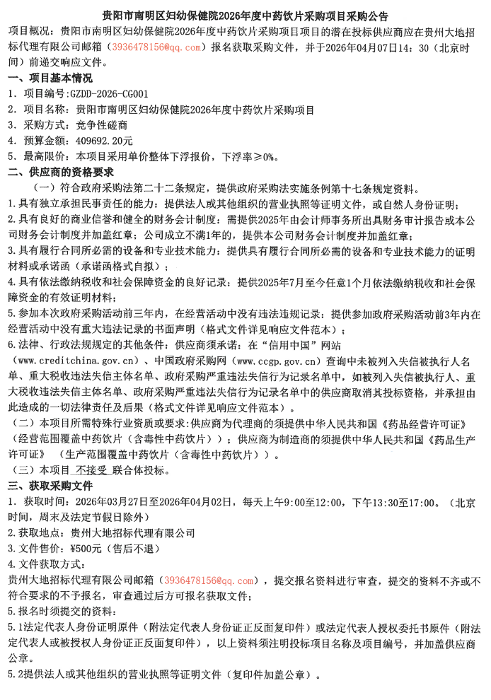 【貴陽市南明區(qū)婦幼保健院】貴州省貴陽市南明區(qū)婦幼保健院2026年度中藥飲片采購項目采購公告