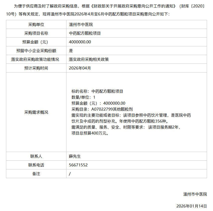 【溫州市中醫(yī)院】浙江省溫州市中醫(yī)院2026年4月至6月中藥配方顆粒項(xiàng)目政府采購(gòu)意向
