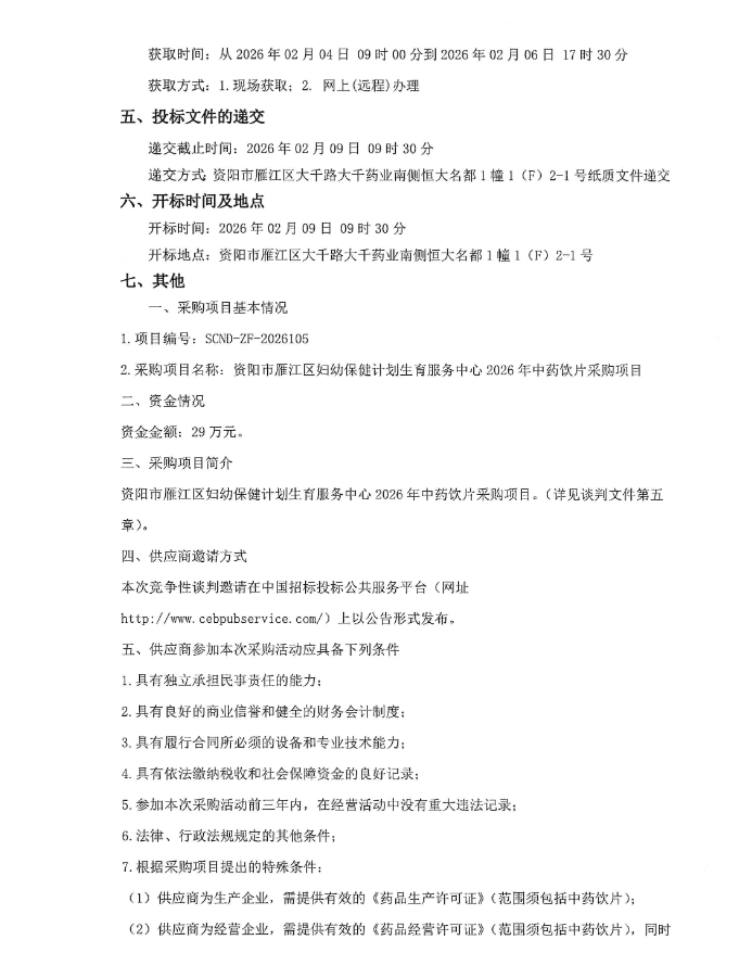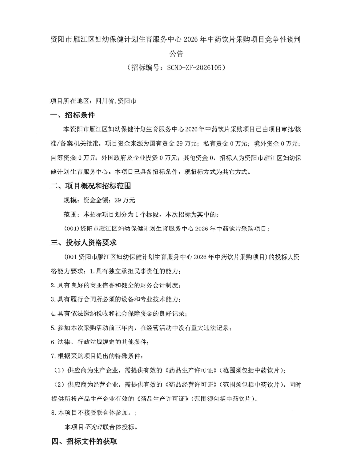 【資陽(yáng)市雁江區(qū)婦幼保健計(jì)劃生育服務(wù)中心】四川省資陽(yáng)市雁江區(qū)婦幼保健計(jì)劃生育服務(wù)中心2026年中藥飲片采購(gòu)項(xiàng)目競(jìng)爭(zhēng)性談判公告