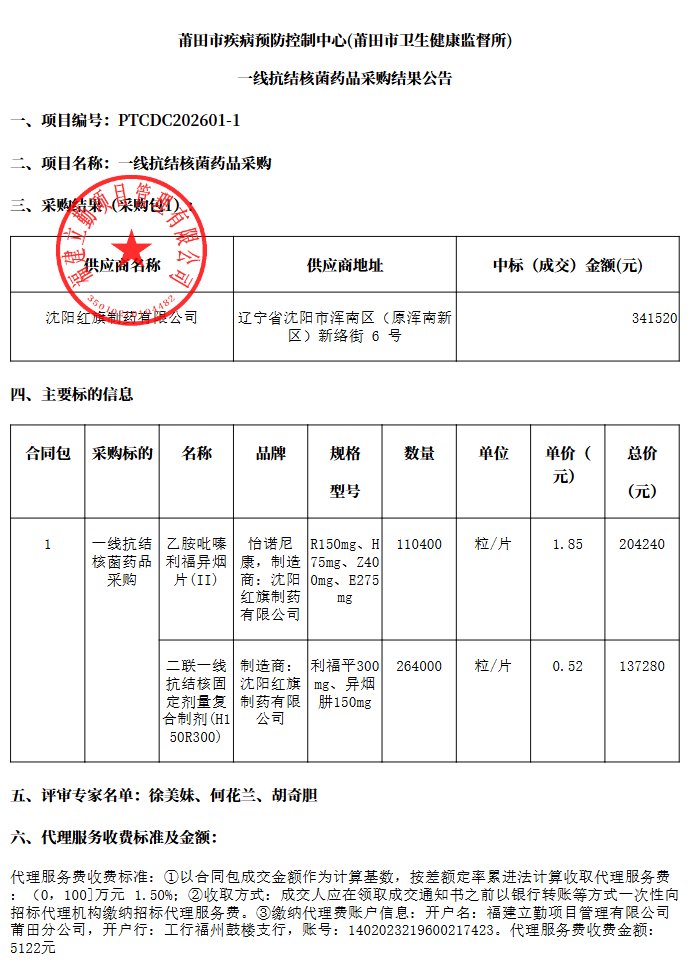 【莆田市疾病預(yù)防控制中心】福建省莆田市疾病預(yù)防控制中心(莆田市衛(wèi)生健康監(jiān)督所)一線抗結(jié)核菌藥品采購結(jié)果公告