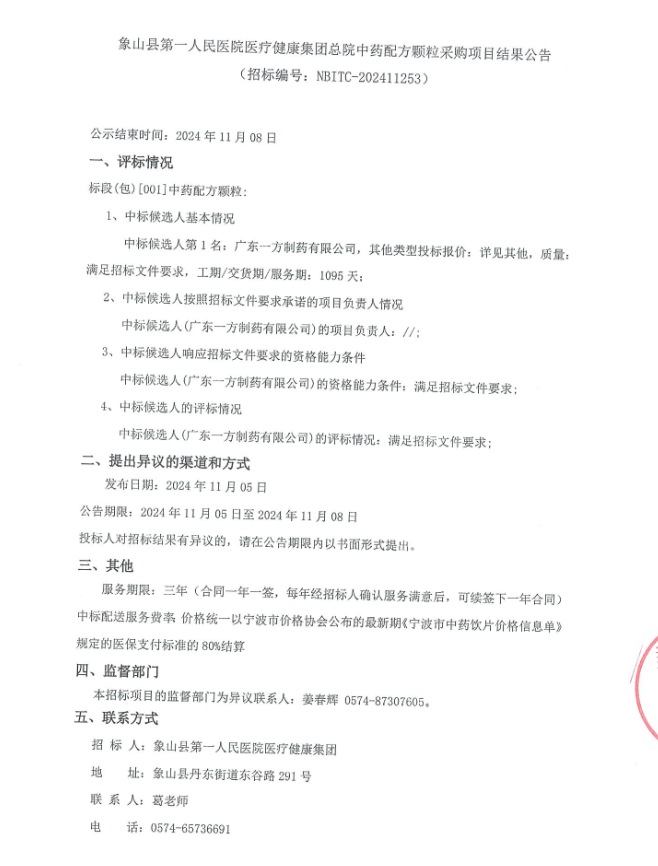 【寧波市象山縣第一人民醫(yī)院】浙江省寧波市象山縣第一人民醫(yī)院醫(yī)療健康集團總院中藥配方顆粒采購項目結(jié)果公告