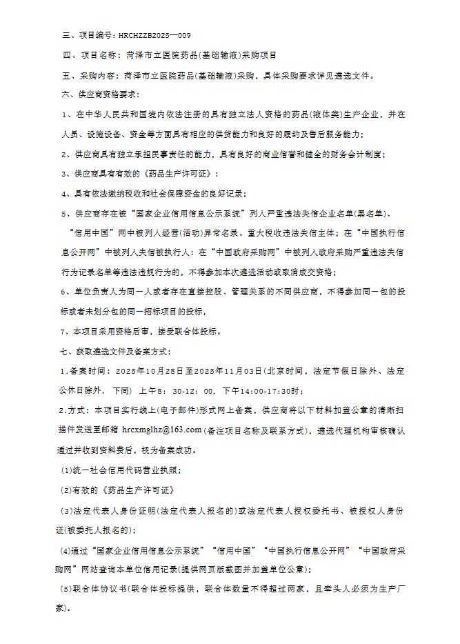 【菏澤市立醫(yī)院】山東省菏澤市立醫(yī)院藥品(基礎(chǔ)輸液)采購項目遴選公告