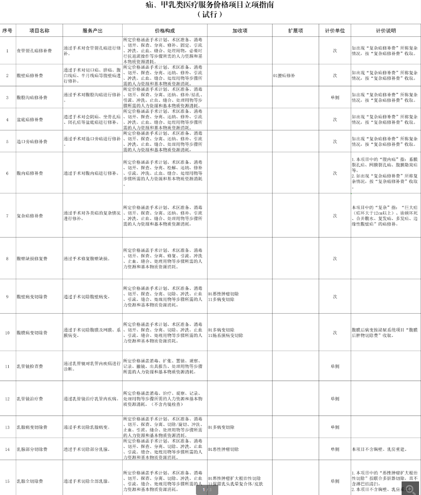 ??? 編制說明:為貫徹落實《深化醫(yī)療服務(wù)價格改革試點方案》,推進(jìn)全國醫(yī)療服務(wù)價格項目規(guī)范編制工作,按照“成熟一批、發(fā)布一批”的工作思路,近日國家醫(yī)保局編制印發(fā)《疝、甲乳類醫(yī)療服務(wù)價格項目立項指南(試行)》,參考2023年版醫(yī)療服務(wù)項目技術(shù)規(guī)范,將現(xiàn)行價格項目映射整合為25項,加收項12項,擴(kuò)展項3項。下一步,國家醫(yī)保局將指導(dǎo)各省醫(yī)保局參考《立項指南》,制定全省統(tǒng)一的價格基準(zhǔn),由具有價格管理權(quán)限的統(tǒng)籌地區(qū)對照全省價格基準(zhǔn),上下浮動確定實際執(zhí)行的價格水平。