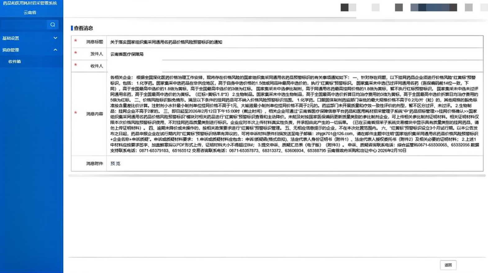 ??三、即日起至2026年2月12日下午15:00時(shí)(截止時(shí)間),相關(guān)企業(yè)可通過(guò)云南省醫(yī)療保障信息平臺(tái)藥品和醫(yī)用耗材招采管理子系統(tǒng)“中“藥品招標(biāo)管理>掛網(wǎng)價(jià)格確認(rèn)>國(guó)家組織集采同通用名藥品價(jià)格風(fēng)險(xiǎn)預(yù)警標(biāo)識(shí)“模塊對(duì)相關(guān)藥品進(jìn)行“紅黃標(biāo)"預(yù)警標(biāo)識(shí)查看和主動(dòng)降價(jià)。未能及時(shí)按國(guó)家醫(yī)保編碼更新質(zhì)量類別的參比制劑企業(yè),可上傳相關(guān)參比制劑證明材料。相關(guān)證明材料僅限本次價(jià)格風(fēng)險(xiǎn)預(yù)警標(biāo)識(shí)使用,不對(duì)掛網(wǎng)藥品質(zhì)量類別進(jìn)行標(biāo)識(shí)。企業(yè)應(yīng)對(duì)本次上傳材料真實(shí)性負(fù)責(zé),并承擔(dān)由此產(chǎn)生的一切后果。(已在云南省招采子系統(tǒng)交易模塊中顯示具有質(zhì)量類別的掛網(wǎng)藥品,請(qǐng)勿上傳證明材料)。